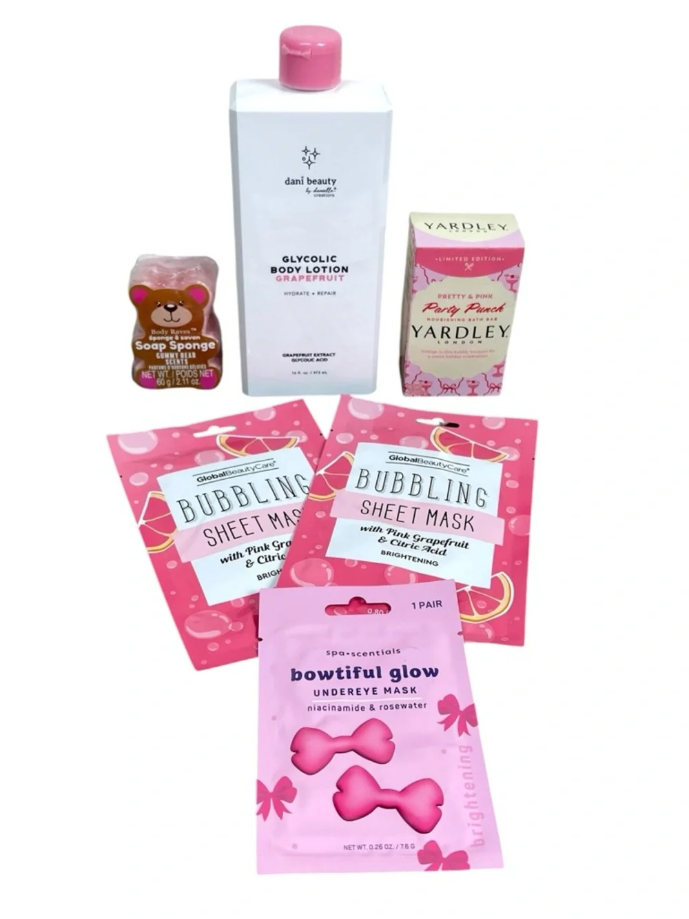 glycolic body lotion in pink paired with pink brightening sheet masks and under-eye masks. Gentle, hydrating formula helps exfoliate and renew skin. Includes pink grapefruit-scented masks for a brightening boost. Ideal for everyday pampering and targeted skin care.