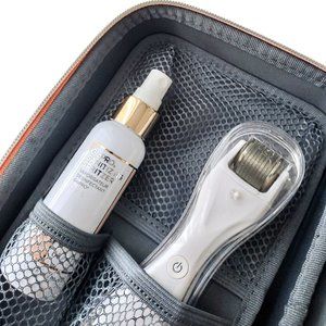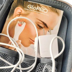 Beauty GloPRO at-home micro needling rejuvenation tool with a pink travel case, charger, and sanitizer spritzer. You will need to buy new blades. in perfect condition. Retail $175 just for the wand.