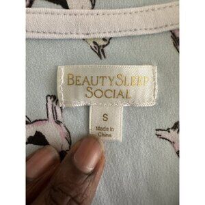 Add some playful charm to your sleepwear collection with this Beauty Sleep Social pajama set featuring a cute dog print. The short-sleeved shirt is designed with a notch collar and button closure for a comfortable fit. Made of a lightweight blend of polyester and spandex, this set is perfect for any season. The pajama shorts come in a classic sleep shorts style and feature the same cute dog print. Available in size S, this regular-fit set is sure to become your go-to for a comfy and stylish night's sleep.
