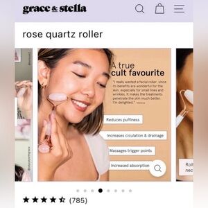 “Rolling with a rose quartz roller is relaxing and de-stressing, especially when the stones are kept cool. It helps to alleviate the appearance of puffiness, fine lines, and tired skin (bye dark circles!). The rolling technique stimulates blood circulation and lymphatic drainage.”