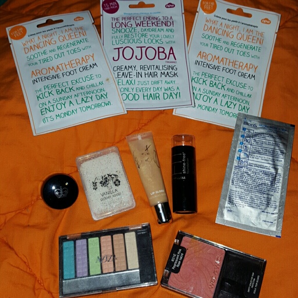 Aziza eyeshadow without the little applicator tool, wet seal blush with brush, 2 feet scrubs & 1 hair mask, 1 pore strip applicator, lip gloss from victoria's secret, maybelline fit me foundation color 235, vanilla paper soap, used once Rimmel gel eyeliner without brush