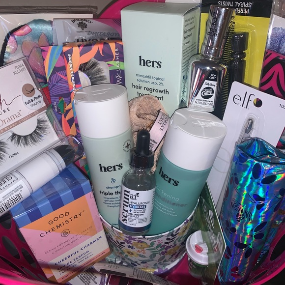 Happy Poshing , baskets include , products , lashes , lash glue , mirrors, face sponges , beauty builders , , makeup , combs,brushes,face or eye masks one Victoria secret item , lip gloss or lipstick , hair cover , great hair growth products ( HERS hair one or more ) tons of small cool items . Nothing will be removed from you’re basket .