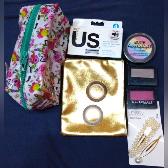 All brand new 2 makeup bags 1 is ispy, 2 rolls of Nail Stickers, Hair Clips, 2 Maybelline Eyeshadows and a Fairy highlight powder, Bic Head-to-Toe 4 cartridge refill Razors. comes with free small gift!