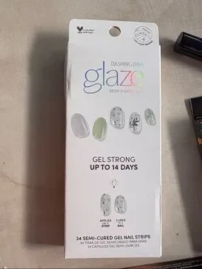 Glaze gel nail strips in white and mint offer a gel-strong finish that lasts up to 14 days. Easy to apply self-adhesive strips for a salon-style look at home.