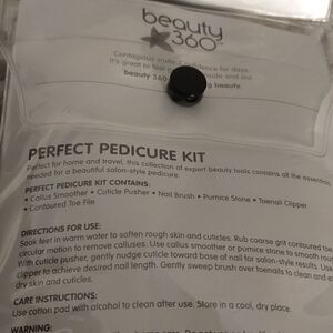 This New factory sealed Beauty 360 Perfect Pedicure Kit contains: Callus smoother, cuticle pusher, nail brush, pumice stone, toenail clippers and contoured toe file all in a clear snap closure pouch. All offers welcome.