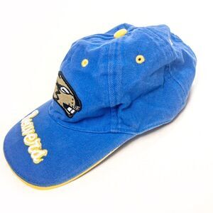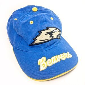 Cornflower blue cotton ball cap with a tan and black beaver head logo patch (front center) and the cursive word “Beavers” patch in white on yellow (brim).