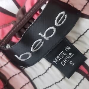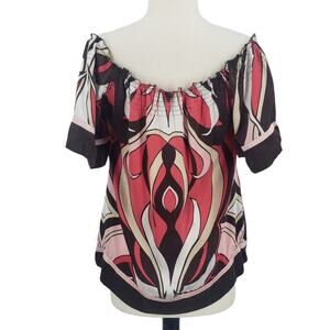 Bebe 100% Silk Off Shoulder Gathered Tie Neck Print Blouse Shirt Top