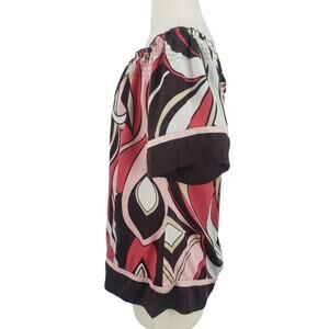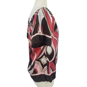 Print is abstract and reminds me of Emilio Pucci . Ruched, gathered at neckline and can be worn on or off the shoulder with adjustable tie