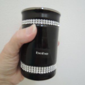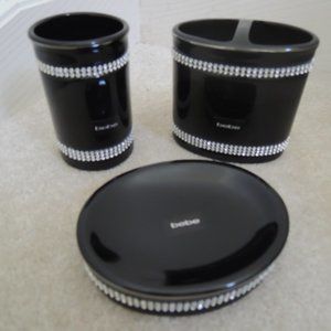 Perfect for gift-giving. Crystal/silver Rhinestone Trimmed 3-Piece Ceramic Bathroom Set in Black. Chic Design, Luxury Bathroom Accessory Set. Bath Accessories Include: Soap Dish, Tumbler, Toothbrush Holder. Stored in a cool dry place. Comes from a smoke-free/pet-free home.