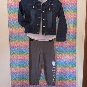 Bebe 3pc girls' outfit has a jean jacket, t-shirt with pink and white strips, and the grey tights have the words Bebe down the left leg. Brand new! size 7-8 kids.