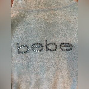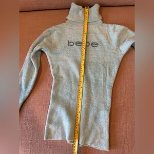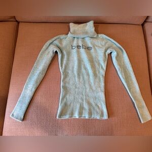 Beautiful soft turtleneck with Bebe logo in rhinestones. Slightly used once. Some light foundation stain by inside of neck collar, ( I included extra pic in outside lighting as well) wash with mild soap.