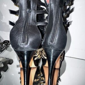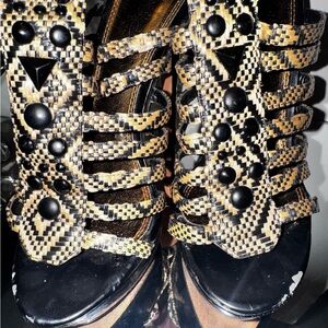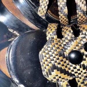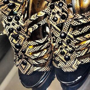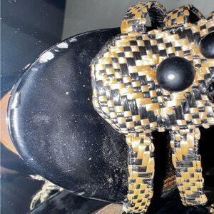 Eye-catching black and beige woven strappy sandals. Decorative black studs and geometric accents add bold detail. Cushioned footbed offers comfortable wear. Secure ankle buckles ensure a stable fit. Stylish choice for day-to-night outfits.