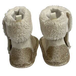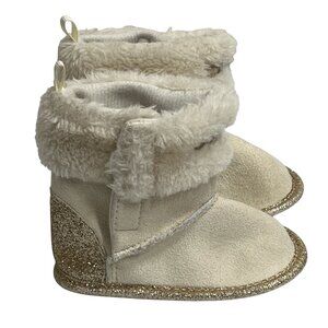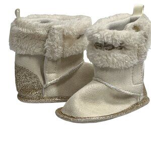 Adorable Bebe baby boots in cream faux suede with gold glitter accents and cozy faux fur lining. Lightweight and soft—perfect for keeping tiny toes warm in chilly weather.