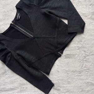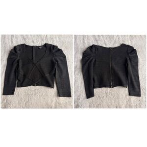 Great used condition. Bandage Puff Sleeve Shimmer Top by bebe in black with silver-tone detailing. Girly chic aesthetic, perfect for a night out or special event. Evening top with v-neck and slightly cropped silhouette. Long sleeves with puff shoulder. Fitted, bodycon silhouette. Pieced bandage construction. Shimmery accent throughout, see video. Exposed back zip closure. Note: light wear with minor threading at sleeve cuff and faint surface discoloration at interior armpit, see photos. Size small, see photos for measurements.