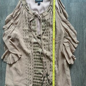 Stylish Bebe blouse in beige. Features metallic embellishments. Perfect for a chic look.