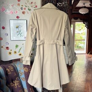 Stylish beige trench coat with a matching belt, flare style bottom. Perfect for any occasion.