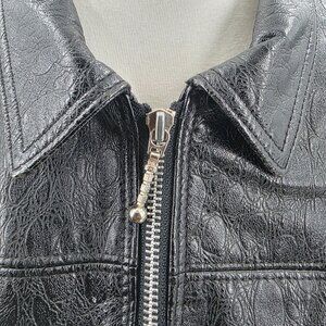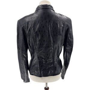 This vintage-inspired Bebe jacket is crafted from 100% leather and features a textured design reminiscent of classic styles. The black leather adds a touch of timeless elegance, while the tailored fit flatters the figure. This piece evokes a sense of sophistication and nostalgia, perfect for those who appreciate vintage aesthetics.