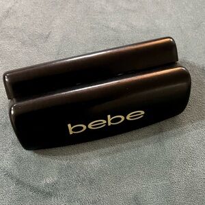 Chic black clamshell eyeglasses case with Bebe logo. Ideal for protecting your glasses.