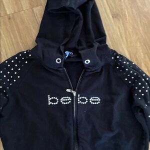 Chic black hoodie featuring studded sleeves. Zip-up front with hood. Iconic Bebe logo.