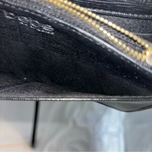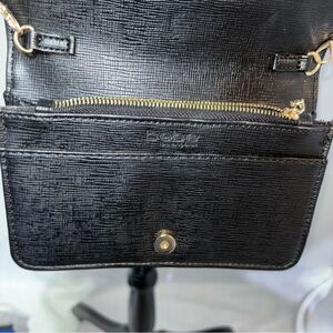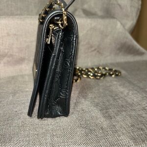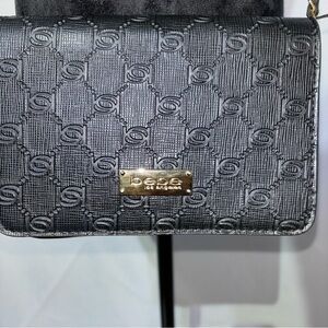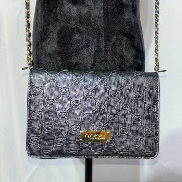 Bebe Los Angeles Black Flap Snap Front Logo Embossed Crossbody Faux Leather and Chain Bag