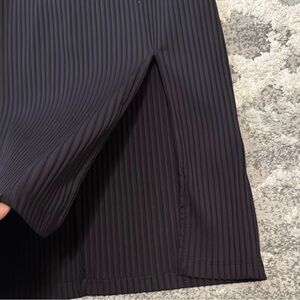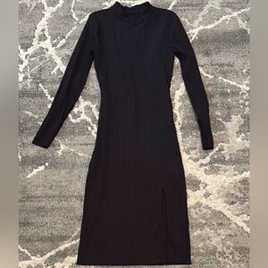 Elevate your style with this sleek and sexy Bebe black ribbed bodycon dress. This long-sleeve, high-neck midi dress hugs your curves in all the right places, while the side slit adds just the right touch of edge. Made with stretchy ribbed fabric for a flattering, comfortable fit.