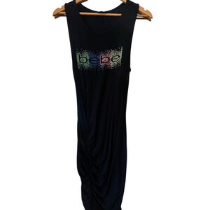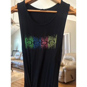 This is a pre-owned Bebe black dress, size small. It features a sleeveless design and a round neckline. The brand name "Bebe" is displayed in colorful rhinestones on the front. The dress has a ruched design on the side. The material is 95% rayon and 5% spandex.
