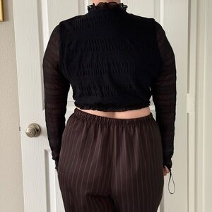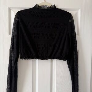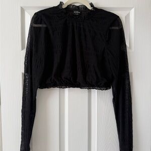 Elegant black sheer top with ruffled neckline and sleeves. Size Large