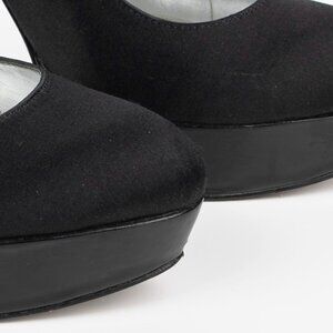 Nearly new black satin Bebe pumps with faux (I believe) leather platform and heel.