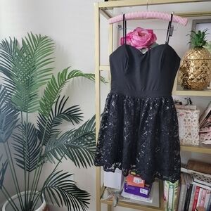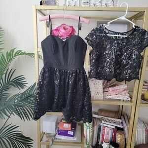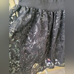 Preowned like new two piece tank Christmas Dress with corset / bustier style top. Can be worn as a formal or black cocktail dress. Features sparkling sequins that shimmer when you walk and a matching sequin tip/ shawl that goes over the dress. Perfect NYE or holiday dress. very sophisticated and elegant.
