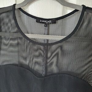 This sophisticated Bebe blouse features a sheer mesh panel at the neckline, creating an elegant illusion detail. The cap sleeves and fitted design enhance its feminine style, making it perfect for both casual and dressier occasions.