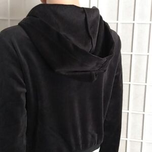 Stay stylish and comfortable with this Bebe Black Velour Hooded Jacket. Perfect for any casual outing.