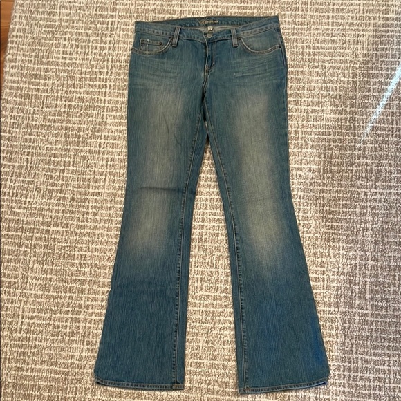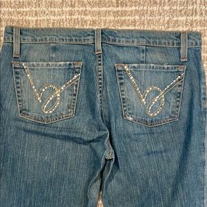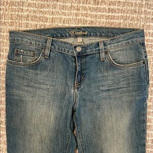These Bebe jeans feature a stylish flare and wide leg design in a classic blue hue. Crafted from medium-weight denim, they offer a comfortable fit with a smooth texture. The subtle fading adds a touch of depth to the overall look, making them a versatile addition to any wardrobe. Back pockets feature gold stitching with rhinestones for an added spark.