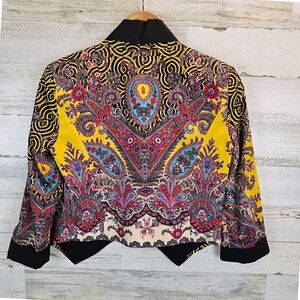 Bebe Boho Chic Vibrant Paisley Open Blazer Jacket Size XS Black Yellow Artsy