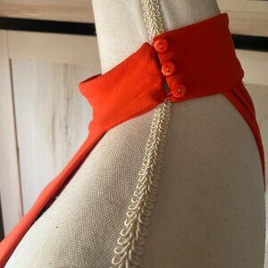 features halter neckline with double button accent on the neck and criss cross lattice back