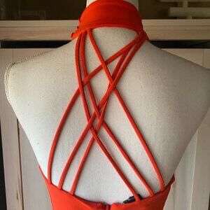 Bebe Bright Red Halter Cocktail Midi Dress Criss Cross Back S Bodycon Sexy
