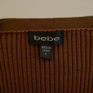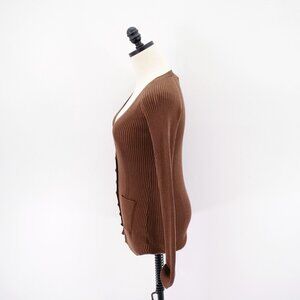 Bebe Brown Plunging V-Neck Leather Button Cardigan Sweater Ribbed Cotton Small Long Sleeve