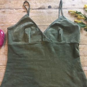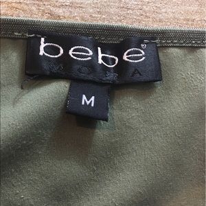 This Bebe camisole feels like suede. Great condition. Measures 19" from shoulder to hem. Mystical Moss Green. Super playful and sexy.