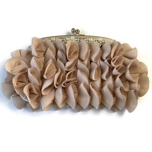 Ultra-romantic clutch in a rose-ruffle design accented by luminous pearlescent beads and haute goldtone hardware. Interior wall pocket. Optional chain strap converts look to shoulder style. Lined. 100% Polyester. Height: 6.5" (16.5 cm), width: 11" (28 cm), depth: 1.5" (3.75 cm). Kisslock closure closure. Color: NATURAL