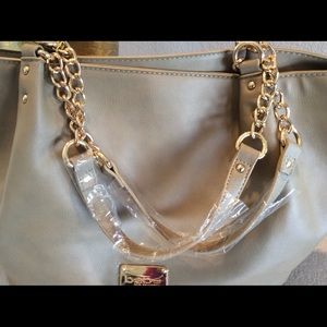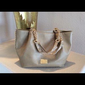 Stylish and practical, Bebe large taupe tote with gold tone chain accent, NWT. Great bag to take you from the office to the evening! Room for all your essentials.