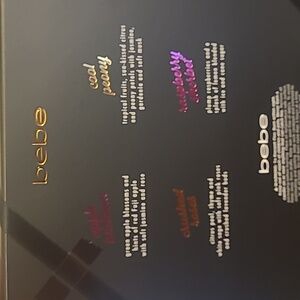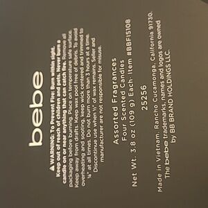 Vibrant set of four Bebe candles. Includes apple blossom, cool peony, caramel kiss, and blackberry rose scents. Ideal for a stylish ambiance.