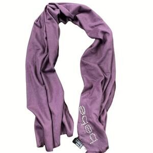 Women's soft purple scarf with a raw hem and rhinestone logo from bebe. Warm and cozy. 80% Polyester 20% Viscose. Hand wash, dry flat. RN14750. Due to light & screen variations, colors may vary slightly from the images