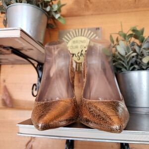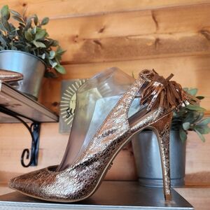 Bebe Crackle Metallic Rose Gold Pointed Toe Stiletto Heels Tassles Cutout Sz 10