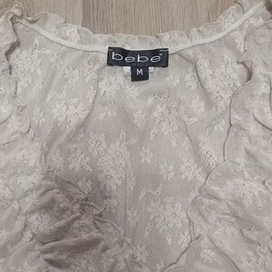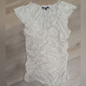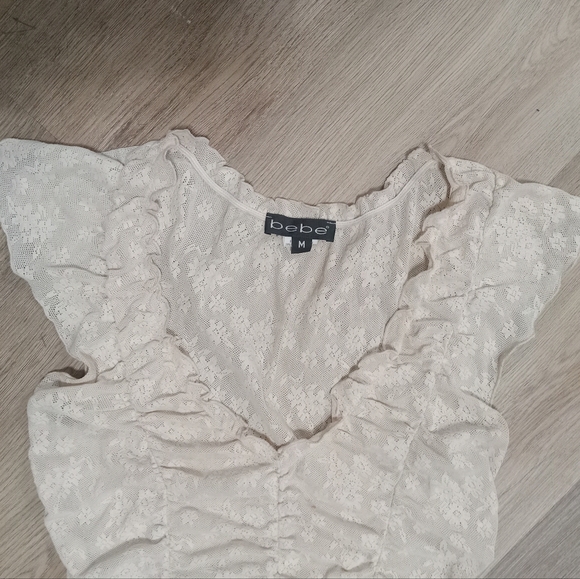 Chic cream top with lace floral design. Features elegant ruffle accents.