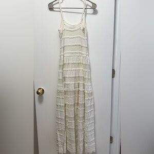 Chic cream maxi dress with textured layers. Sleeveless design for versatile wear. Size XS