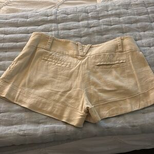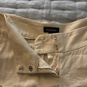 Elevate your summer style with these Bebe low rise linen shorts in a versatile cream color. Designed for a chic and tailored look, they offer a flattering fit perfect for any casual occasion. Enjoy the comfort and elegance of these wardrobe essentials.