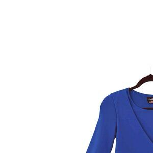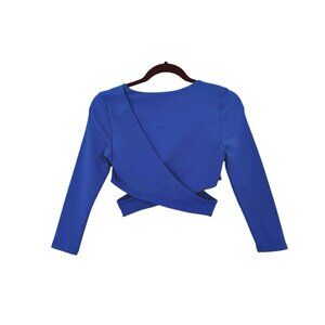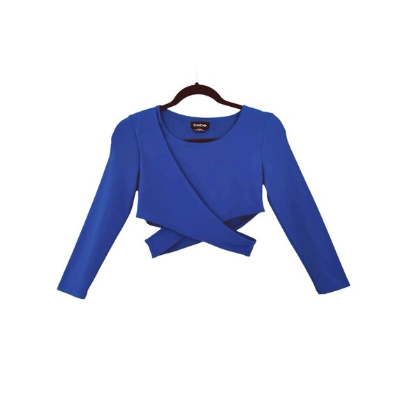 Bebe Vibrant Blue Round Neck Criss Cross Side Cut Out Detail Faux Wrap 3/4 Elbow Sleeve Bodycon Silhouette Stretch Jersey Knit Crop Top Size Small - Excellent condition.