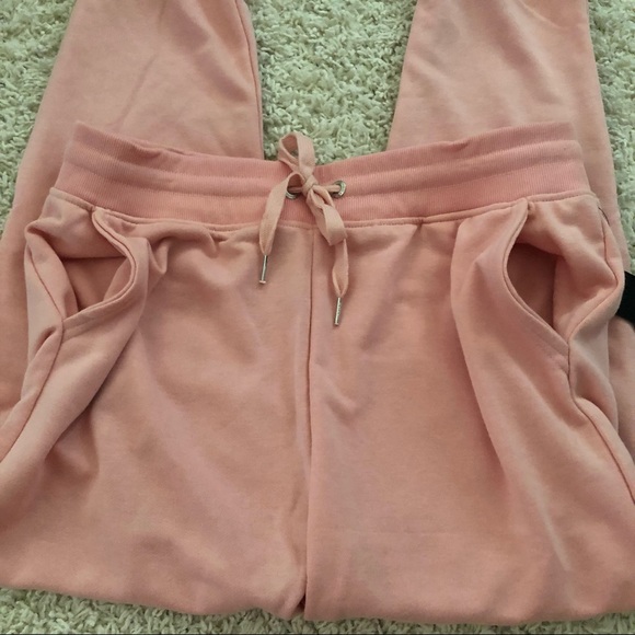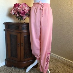 Darling Rose Colored Sweatpants, Elasticized Drawstring Waist with Silver bebe Hardware, Front Pockets, Ribbed Cuff Hem, Contrasting Pink bebe down one leg, Super Soft