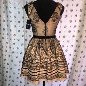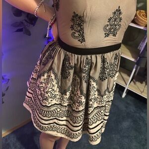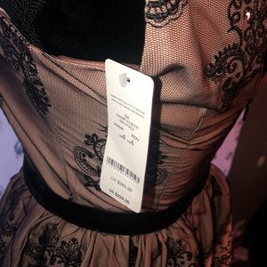 Gorgeous cocktail dress Rosey light pink, Sleeveless, Paisley and floral black embroidery and black sequins. Size 4 /Small. She has a Beautiful multi layer lining on the skirt. Two mesh petticoat linings that makes the dress fluff out, and each of those have a silky pink trim at the bottom. And an additional soft silky pink lining on the bottom layer, that is the same material that lines throughout the entire dress. Zippers in the back. It’s a Rosie pink and the name of the color is Rose Dust. The tags were pulled since the photo and wore her one time.