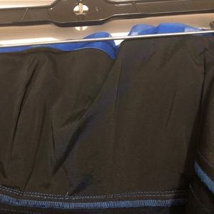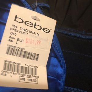 Blue Strapless Bebe dress. Chiffon material in Breast area. Very pretty! Stretch material and does zip in the back. Sits above knee line.