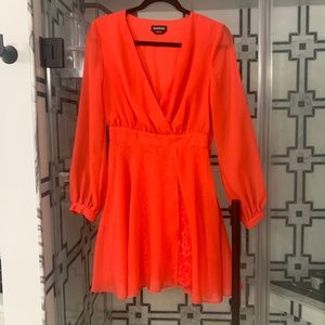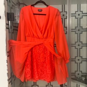 Bebe dress. Coral colored. Size 4. Sheer arms and layer over lace under skirt.
